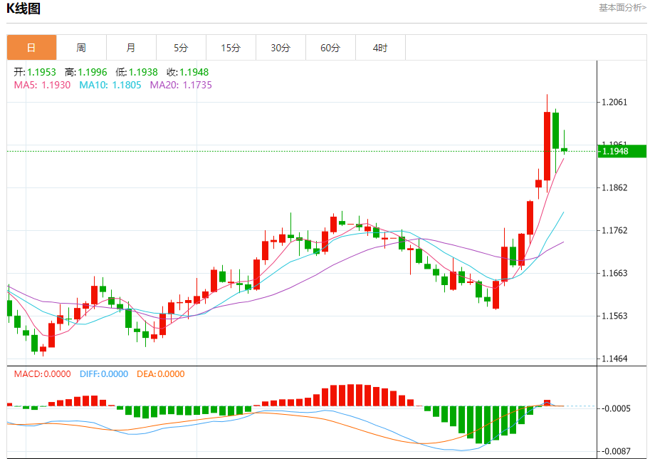 今日周四,截止目前欧元兑美元报1.1949,下跌0.05%。