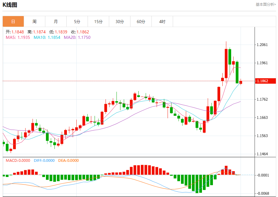 今日周一,截止目前欧元兑美元报1.1863,上涨0.09%。