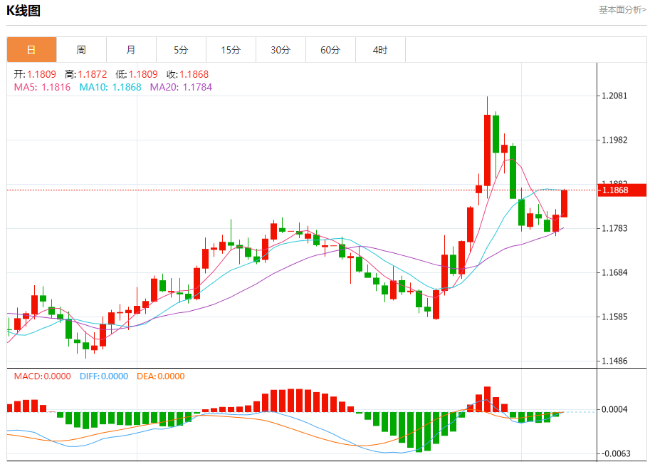 今日周一,截止目前欧元兑美元报1.1874,上涨0.51%。