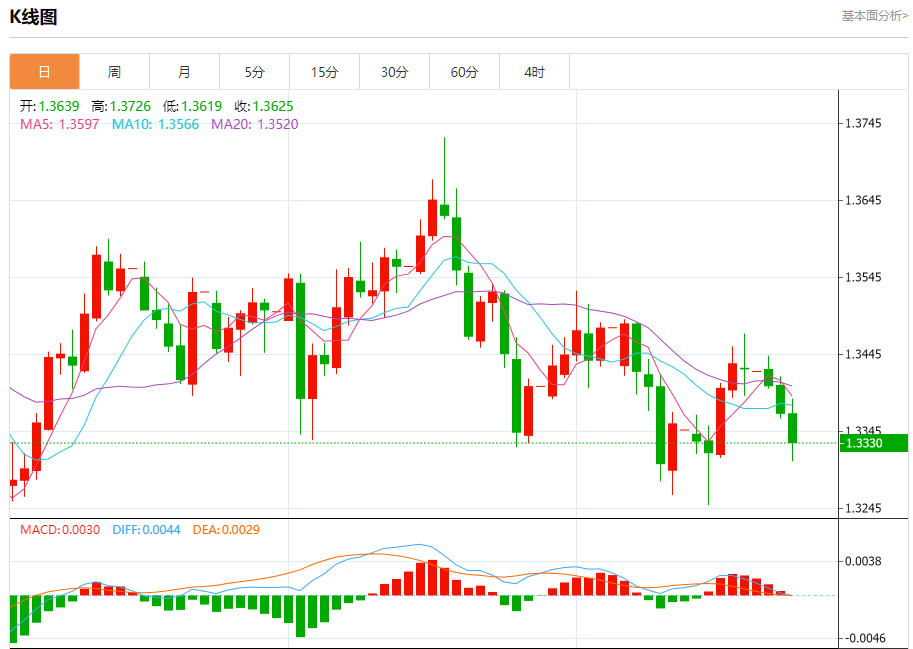 周三欧市盘中,英镑兑美元交投于1.3330,跌幅为0.29%。