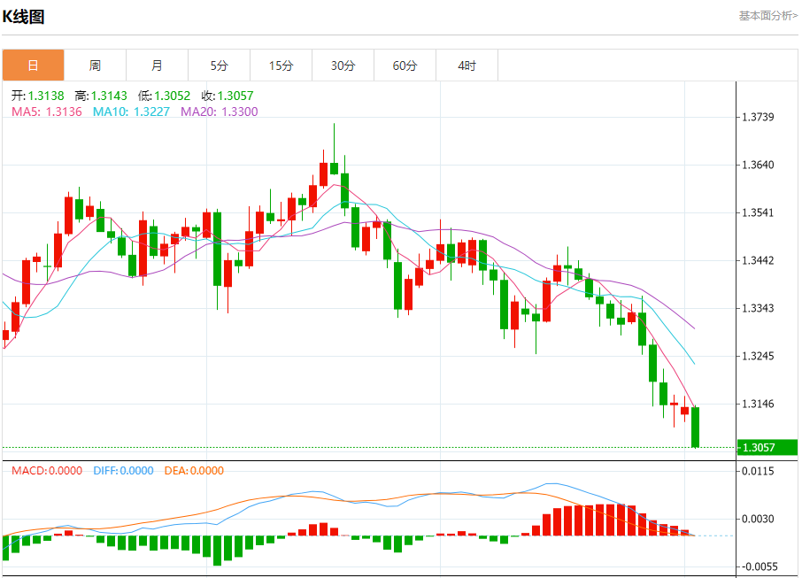 周二欧市盘中,英镑兑美元交投于1.3058,跌幅为0.62%。