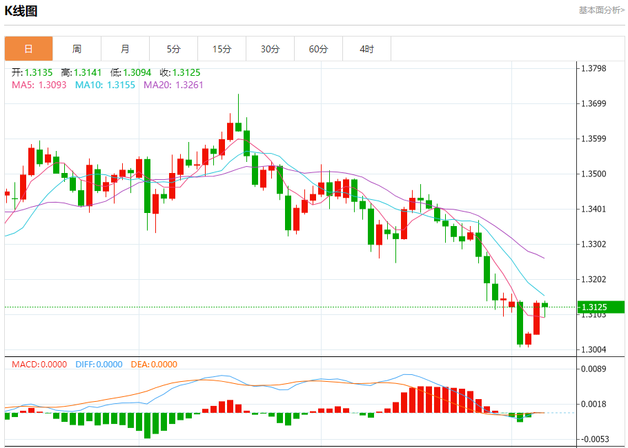 周五欧市盘中,英镑兑美元交投于1.3126,跌幅为0.08%。