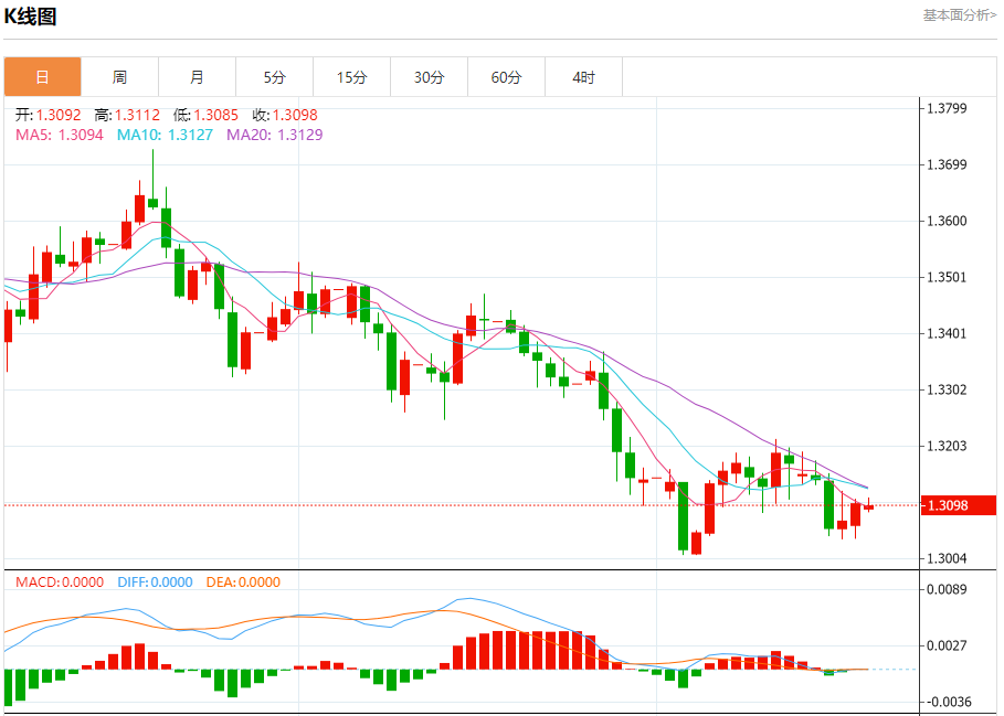 周一欧市盘中,英镑兑美元交投于1.3099,跌幅为0.02%。