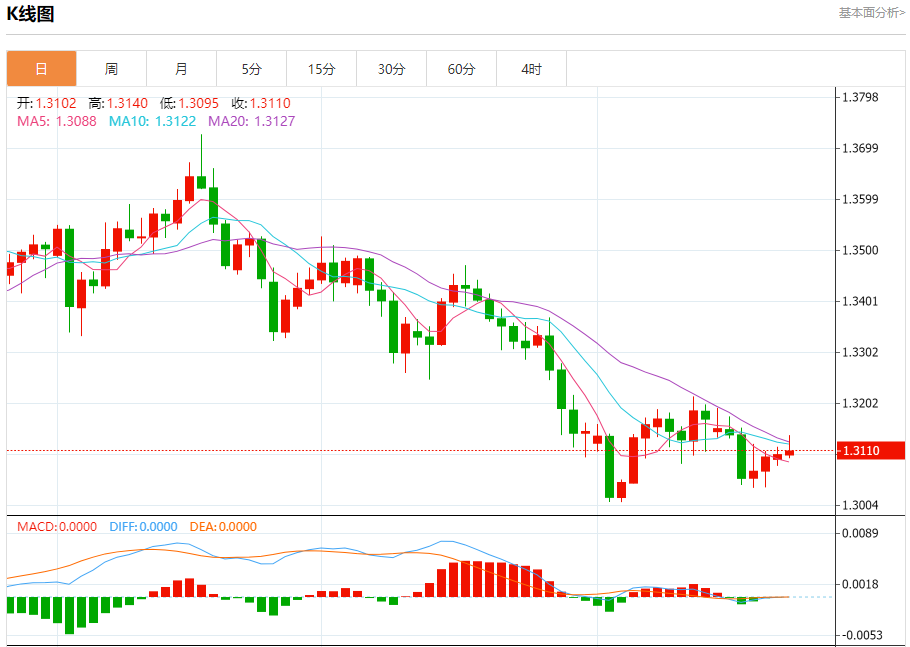 周二欧市盘中,英镑兑美元交投于1.3111,涨幅为0.04%。