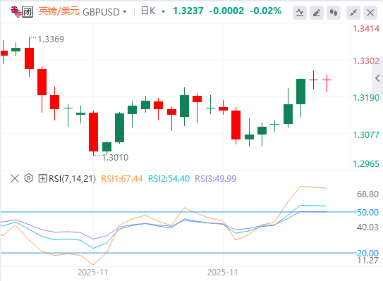 相对强弱指数(14)显示为53,处于中性区间,表明市场动量正温和恢复。从汇率波动区间来看,从1.3675高点到1.3011低点的38.2%回撤位位于1.3264附近,该位置构成近期阻力;50%回撤位则在1.3343以上。