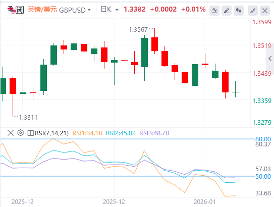 日线图显示,英镑/美元现报1.3404。21日均线高于其他较长周期均线,50日和200日均线呈上升态势,100日均线趋平。价格位于50日和100日均线上方,但低于21日均线。200日均线(1.3406)构成即时阻力,100日均线(1.3365)提供支撑。RSI指标升至48中性边缘但仍低于中线,显示动能减弱。