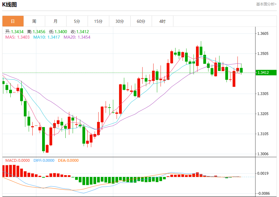 周三欧市盘中,英镑兑美元交投于1.3414,跌幅为0.16%。