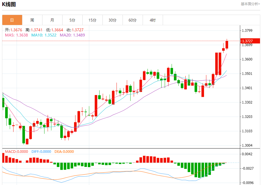 周二欧市盘中,英镑兑美元交投于1.3727,涨幅为0.37%。