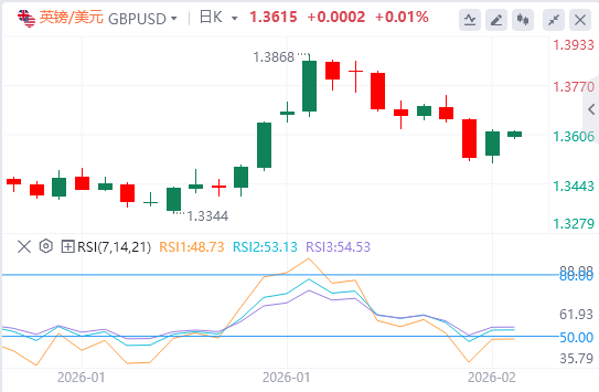 日线图中,英镑/美元保持在100日均线上方,保持多头偏向。当价格下跌时,需求会高于平均水平。布林带显示价格沿中段上方走动,包管线扩大,暗示动能上升。RSI在52(中性)稳定在50线上方,保持适度的上行倾斜。