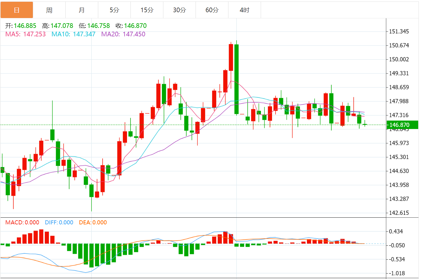 今日周五,截止目前美元兑日元报144.568,下跌0.13%。