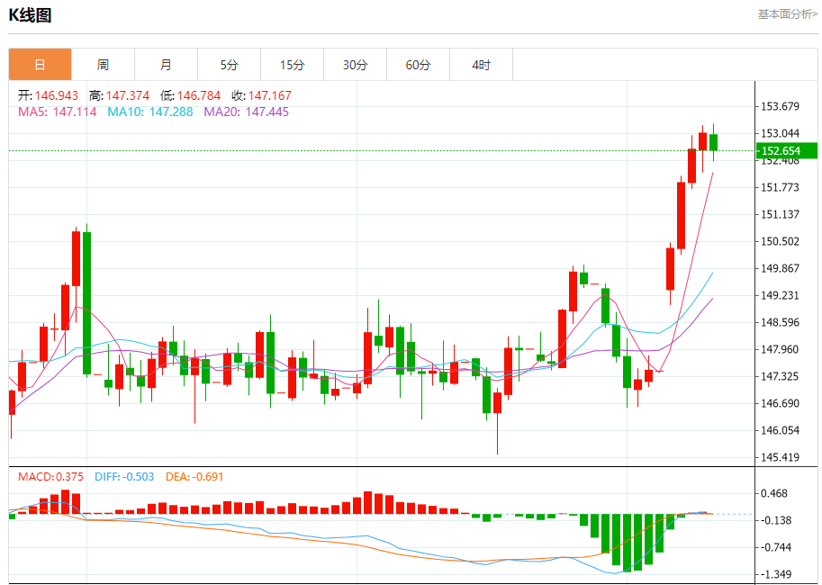 今日周五,截止目前美元兑日元报152.666,下跌0.26%。