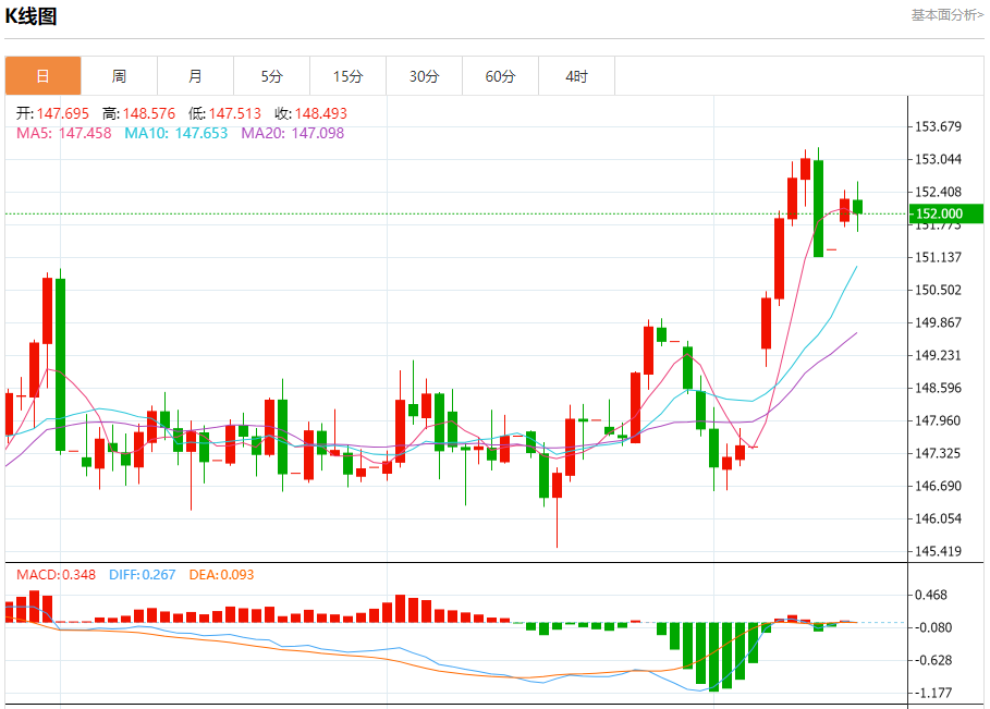 周二纽盘,美元兑日元交投于152.001,跌幅为0.19%。