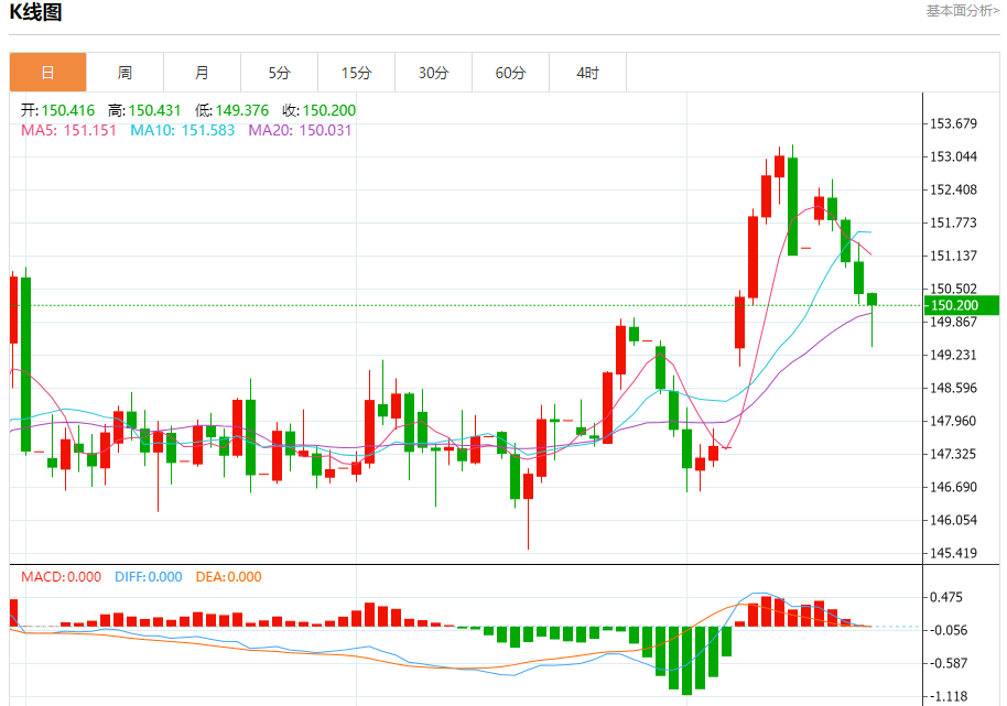 今日周五,截止目前美元兑日元报150.201,下跌0.15%。