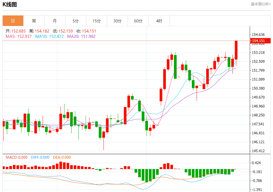 周四纽盘,美元兑日元交投于154.155,涨幅为0.93%。