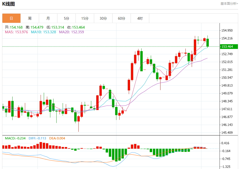 周二纽盘,美元兑日元交投于153.465,跌幅为0.49%。