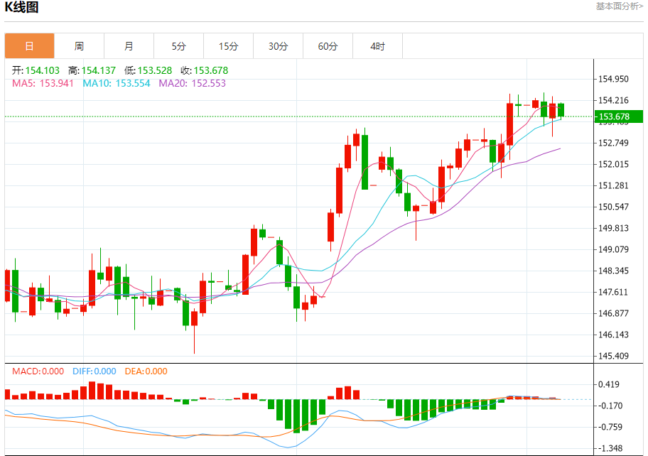 今日周四,截止目前美元兑日元报153.689,下跌0.28%。