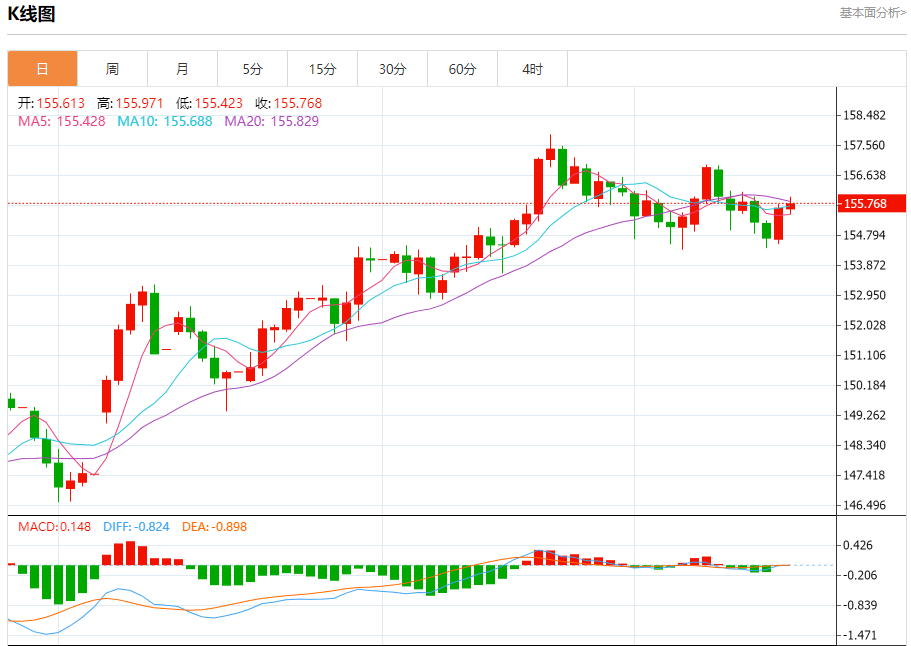 今日周四,截止目前美元兑日元报155.761,上涨0.07%。