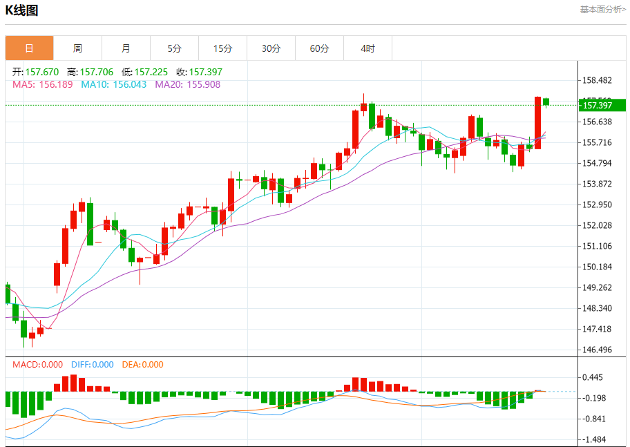 今日周一,截止目前美元兑日元报157.417,下跌0.21%。