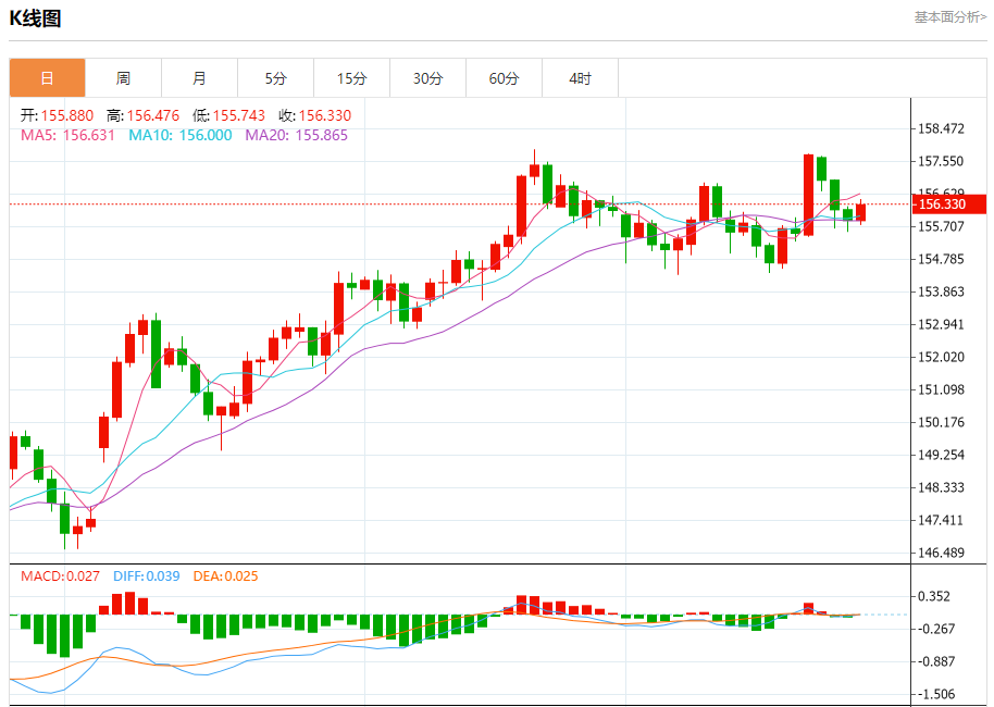 今日周五,截止目前美元兑日元报156.353,上涨0.29%。