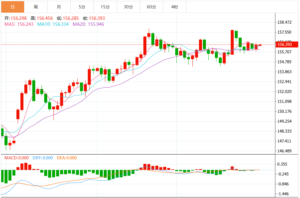 短期支撑位关注155.80-156.00区间,上方阻力位于156.50及157.00关口。RSI指标位于60附近,显示多头动能仍在,但短线略有放缓,市场可能以高位震荡或缓步上行为主,等待新的政策或宏观催化因素。