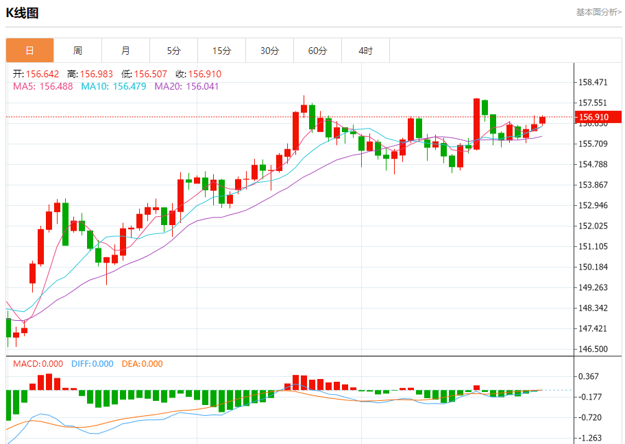 今日周五,截止目前美元兑日元报156.938,上涨0.21%。