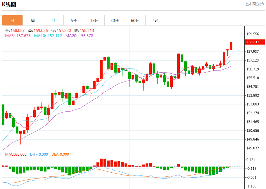 周二纽盘,美元兑日元交投于158.843,涨幅为0.44%。