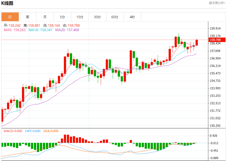 周四纽盘,美元兑日元交投于158.825,涨幅为0.34%。