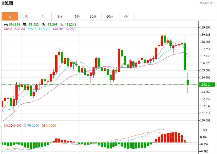 周一纽盘,美元兑日元交投于154.281,跌幅为0.91%。