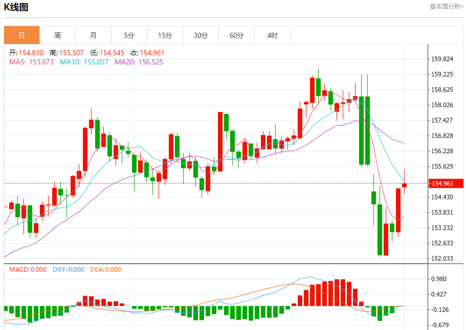 周一纽盘,美元兑日元交投于154.973,涨幅为0.12%。