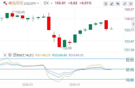 相对强弱指数(RSI)位于39,位于中线以下,显示买盘压力减弱,暗示跌破154.91可能将回调幅度扩大至50%回撤位154.91。后者标志着更深的底层,若有突破,回撤可能延长。