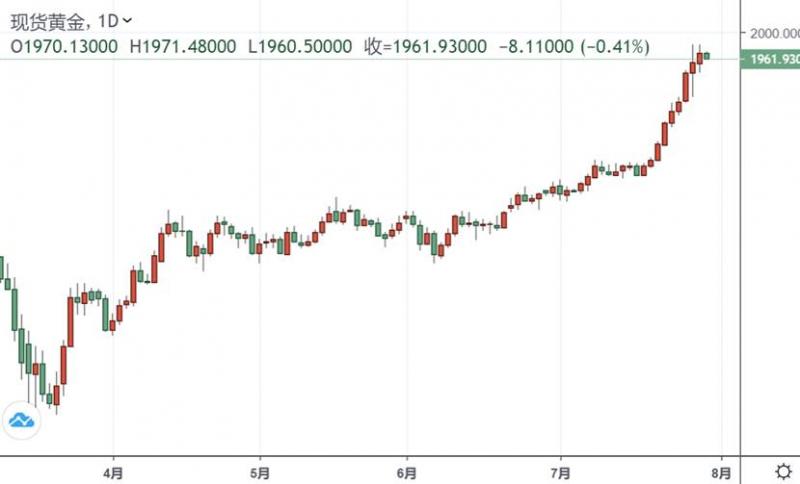 与此同时,现货黄金昨日惊现急涨急跌一幕,美联储发表声明后,现货金上涨,并在美联储主席鲍威尔讲话期间升至1,980美元,逼近周二触及的1,981美元的纪录高位,但之后回吐涨幅,下跌0.4%,报1,951.99美元。最终收于1970美元附近。周四亚市盘中,金价短线下挫触及1960美元。