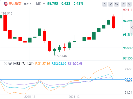 1月12日,周一欧市盘中,美元指数在经历四天的上涨后正在失去地位,周一欧洲时段交易在98.80附近。 动能指标显示14日相对强弱指数(RSI)为53(中性),反映出动能改善。