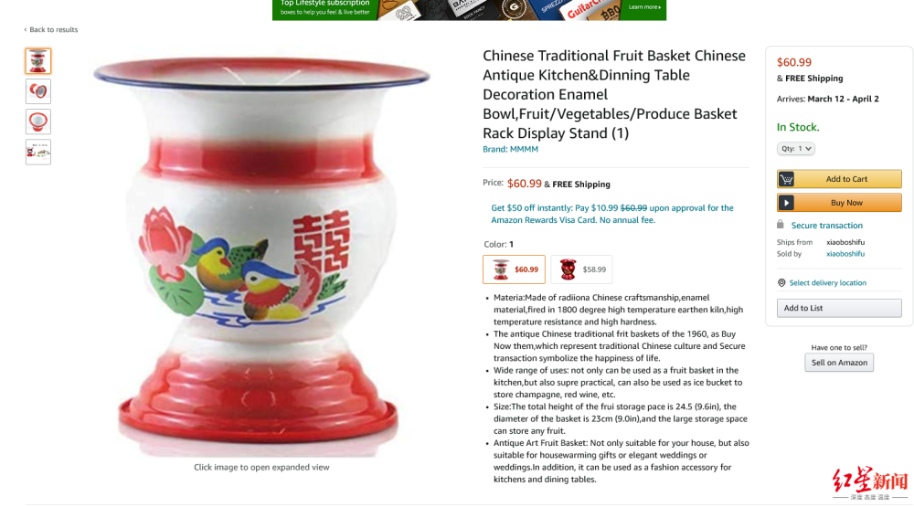 2月22日,红星新闻记者打开美国亚马逊官网,搜索“chinese+basket”(中国菜篮)后,在商品列表中找到了这款正在售卖的痰盂。