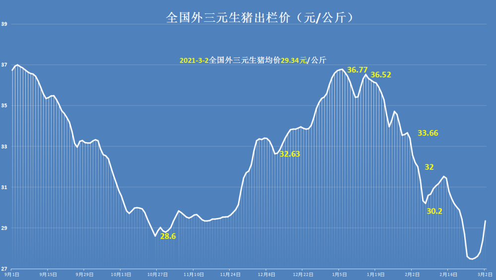 据猪价系统显示,截止到3月2日,全国外三元生猪均价维持在29.34元/公斤,猪价大部上涨,相比前一日涨幅达到了0.95元/公斤!