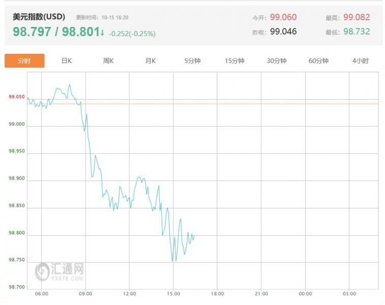 周三(10月15日)亚洲时段,美元走跌失守99关口,最新美元指数报98.801,跌幅0.25%,市场预计,美联储在10月和12月将分别降息25个基点,整体政策基调偏鸽,这对美元走势构成压力。