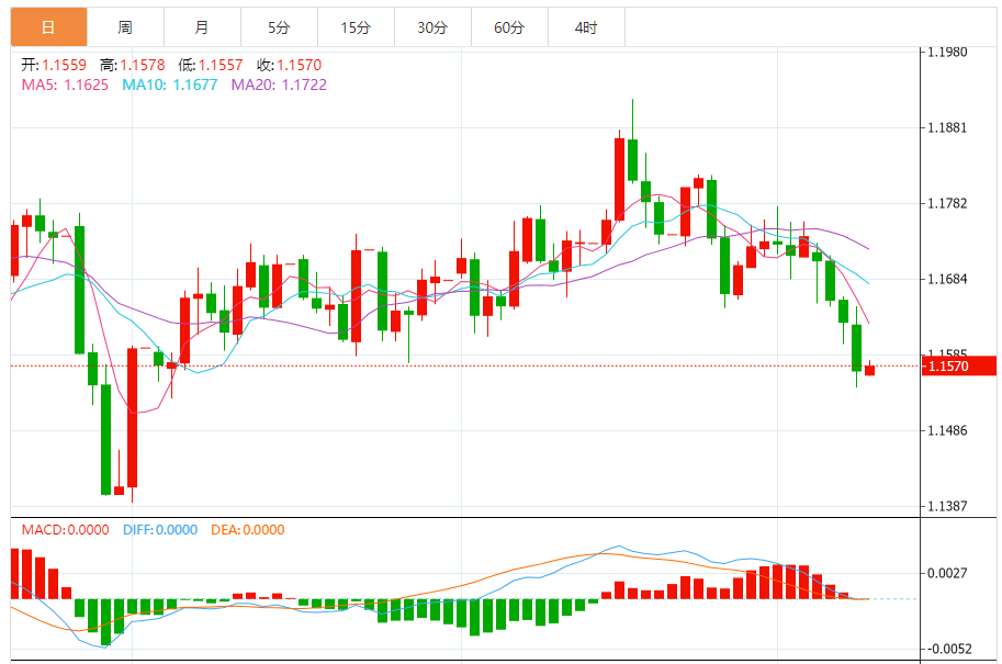 周五,欧元/美元徘徊于1.1571下方,现交投于1.1570附近,涨幅0.05%。