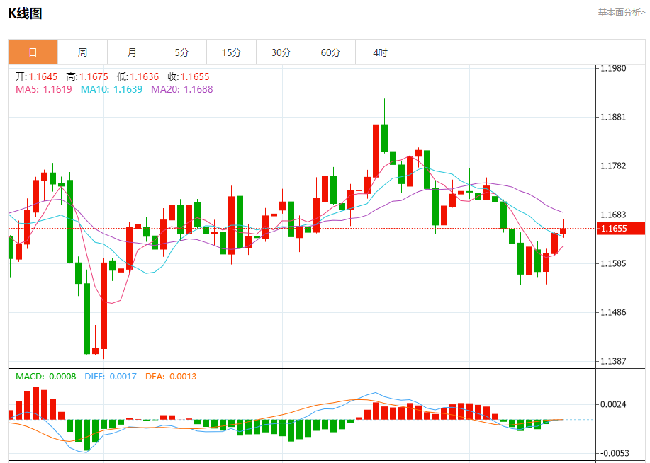 技术点评:RSI技术指标大于中性区域50。 MACD技术指标处在其信号线之上看多。 配置为正。 此外,价位高于其20天及50天移动平均线 ( 分别位于1.1629 和1.1620 )。