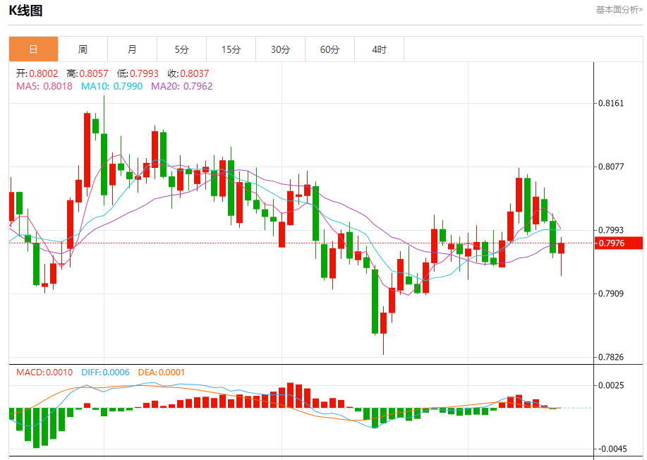 技术点评:RSI技术指标小于中性区域50。 MACD技术指标处在其信号线之下看空。 配置为负。 此外,价位低于其20天及50天移动平均线 ( 分别位于0.7993 和0.8001 )。