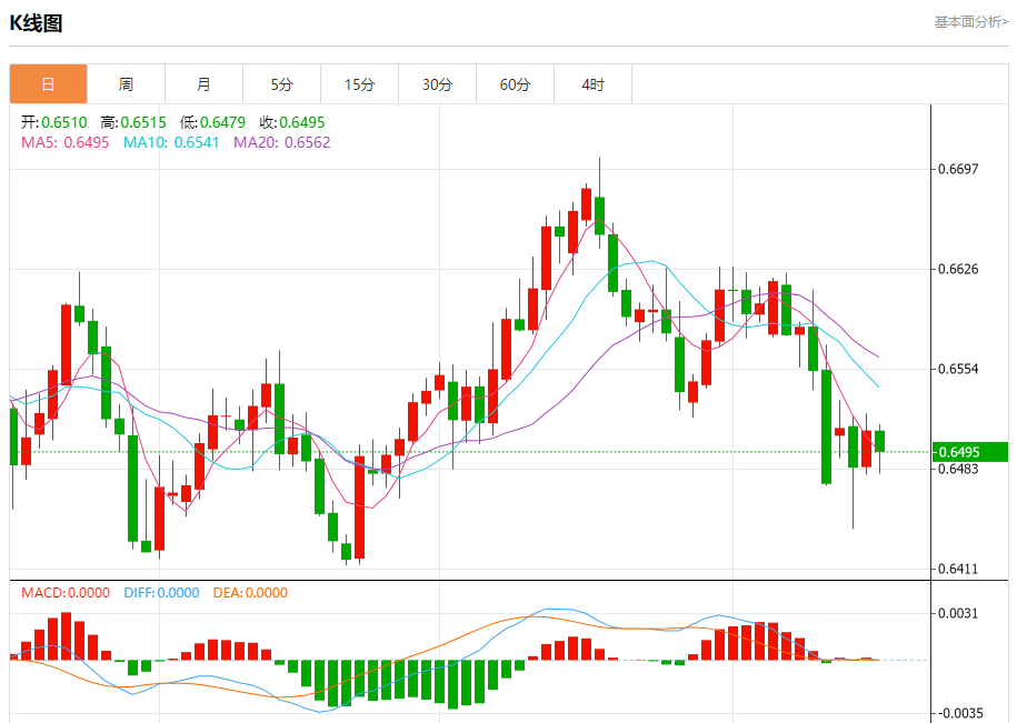 技术点评:RSI技术指标小于中性区域50。 MACD技术指标处在其信号线之下看多。 MACD必须突破其零线,才能预期出现进一步下行。 此外,价位低于其20天及50天移动平均线 ( 分别位于0.6515 和0.6505 )。 最后,价位跌破其布林线通道下轨 (位于0.6502。