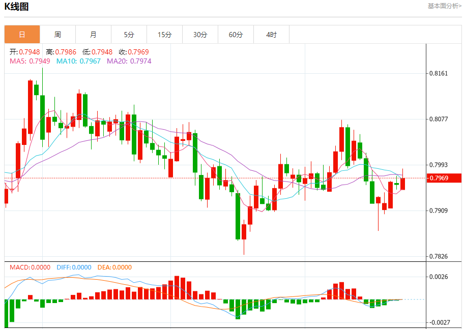 技术点评:RSI技术指标大于中性区域50。 MACD技术指标处在其信号线之下看空。 RSI突破50应该会触发进一步的损失。 此外,价位低于其20天及50天移动平均线 ( 分别位于0.7961 和0.7961 )。
