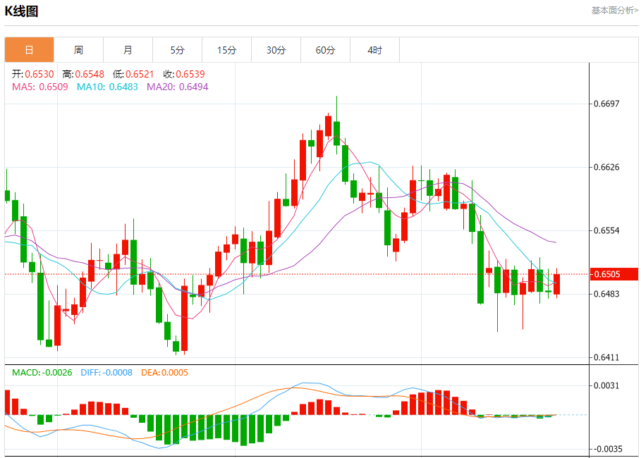 技术点评:RSI技术指标小于中性区域50。 MACD技术指标处在其信号线之下看空。 配置为负。 此外,价位低于其20天及50天移动平均线 ( 分别位于0.6490 和0.6493 )。