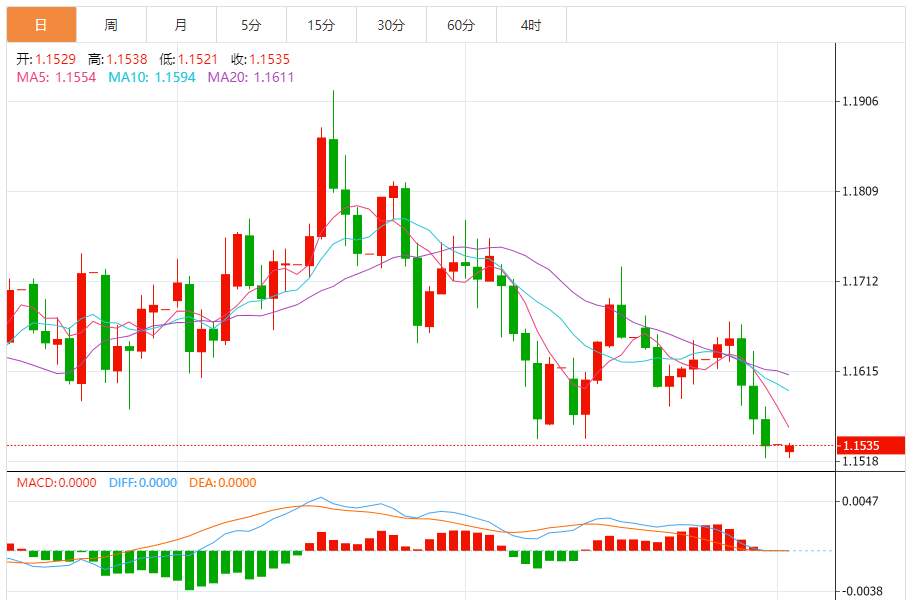 周一,欧元/美元徘徊于1.1536下方,现交投于1.1535附近,跌幅0.01%。