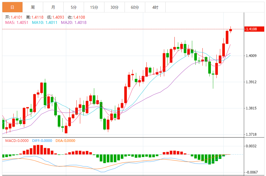 周三,美元/加元徘徊于1.4110下方,现交投于1.4108附近,涨幅0.04%。