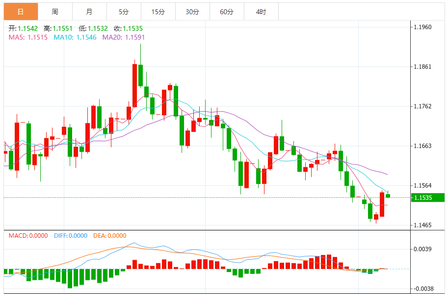 周五,欧元/美元徘徊于1.1535下方,现交投于1.1534附近,跌幅0.11%。