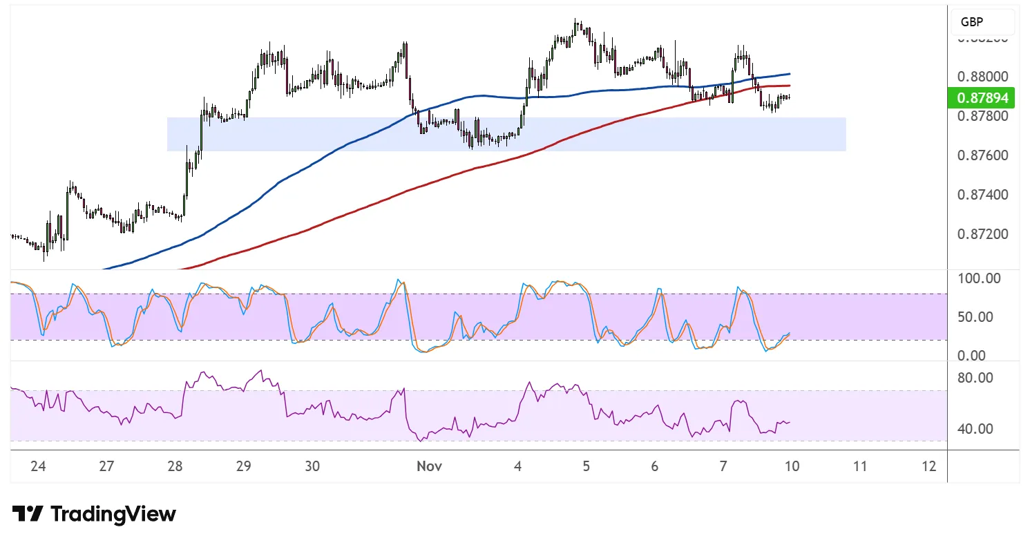 该货币对目前正在测试0.8780-0.8790附近的颈线支撑区域,该区域与100SMA和200SMA动态支撑位重合。跌破这一关键区域可能会确认双顶形态,并引发与该形态高度大致相同的下降趋势,从而可能使欧元兑英镑跌至0.8720水平或更低。
