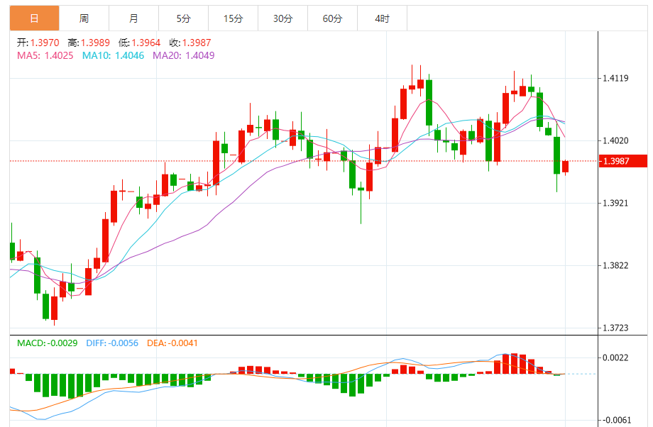 周一,美元/加元徘徊于1.3989下方,现交投于1.3987附近,涨幅0.11%。