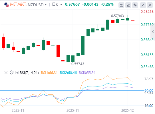 此外,中国11月CPI/PPI通胀数据将于今日早间公布(北京时间09:30),作为新西兰最大出口市场,中国经济数据的表现将直接影响乳制品、木材等新西兰商品需求预期,进而通过贸易渠道对纽元产生脉冲式影响。