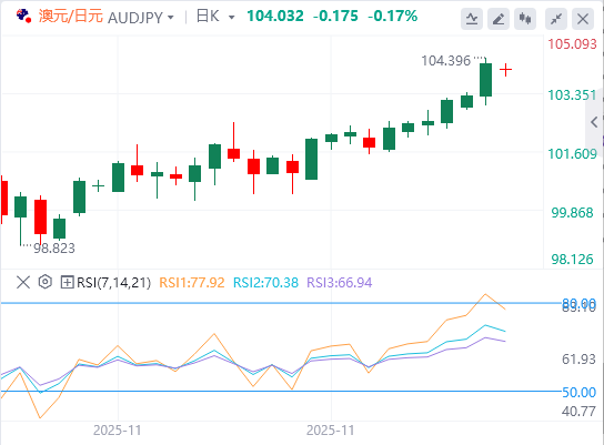 布林带在价格徘徊于上方带时扩大,显示出强劲的上行动能和拉长的上涨。RSI在70.60超买,可能限制短期涨幅。初始支撑位于中段,约102.02,下一条支撑位为100.03。日收盘若高于乐队顶部,将延长攀升趋势,而未能守住中线则可能引发更深的回撤。