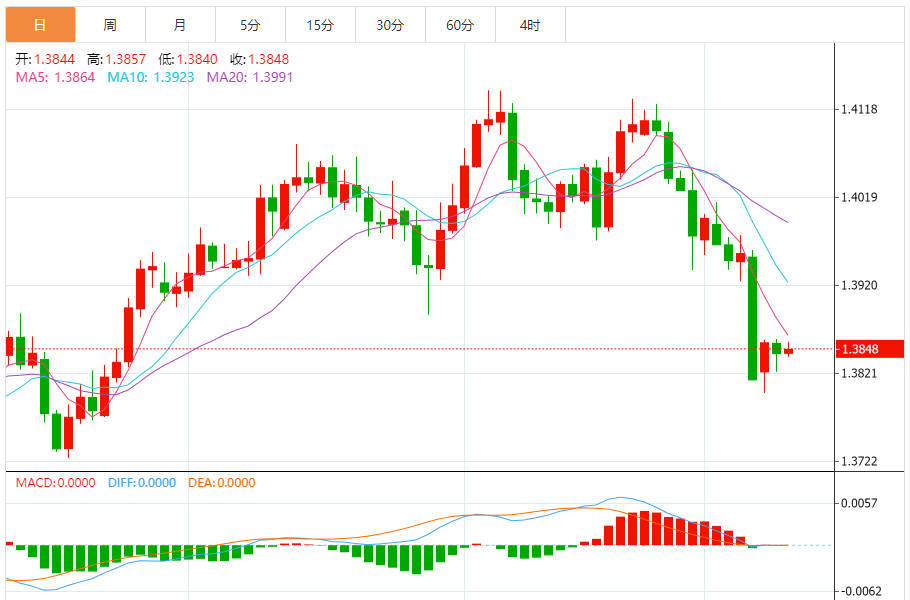 周三,美元/加元徘徊于1.3851下方,现交投于1.3848附近,涨幅0.03%。