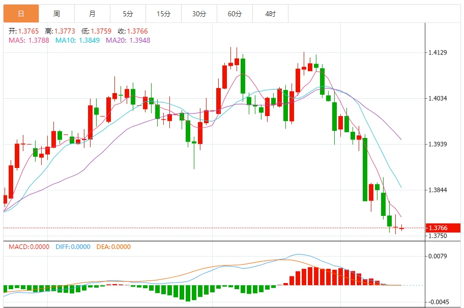 周一,美元/加元徘徊于1.3768下方,现交投于1.3766附近,跌幅0.01%。